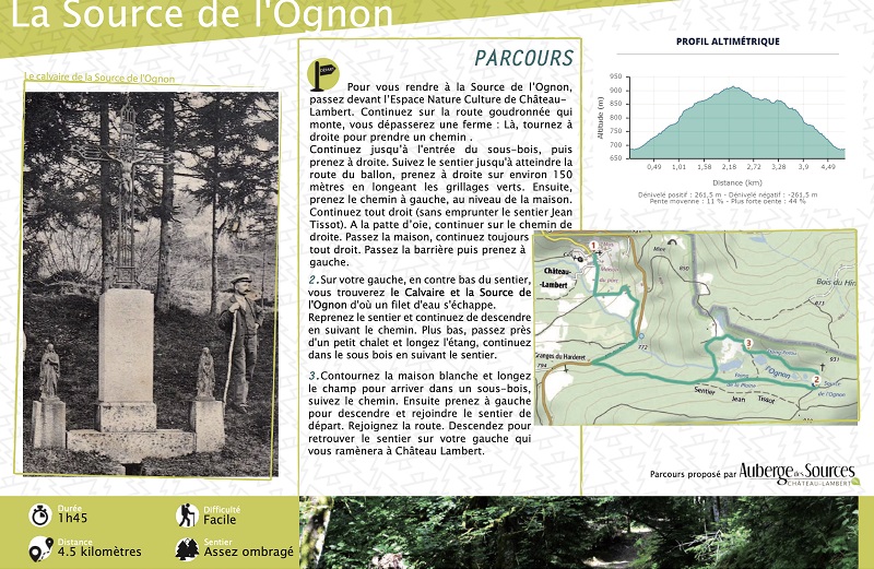 Au coeur de la Forêt vosgienne, vous pourrez découvrir le petit monument à la Source de L'Ognon, affluent de la Saône qui parcours plus de 210km la Haute-Sône pour finir à Heuilley-sur-Saône en Côte d'Or. Vous passerez également devant de charmants étangs et de belles clairières.